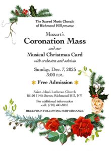 Join The Sacred Music Chorale of Richmond Hill for a beautiful afternoon of music as we present Mozart’s Coronation Mass along with our Musical Christmas Card featuring orchestra and soloists.